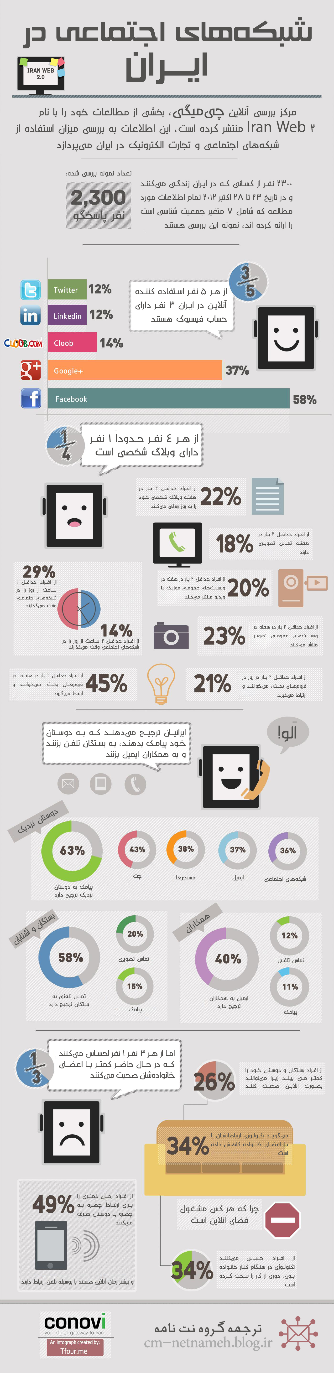 میزان و اثرات استفاده از شبکه های اجتماعی و ابزارهای آنلاین ارتباطی مثل چت، تماس تصویری و ... و همچنین استفاده از تلفن در ارتباطات بین فردی ایرانیان در این اینفورگراف مورد بررسی قرار گرفته است.