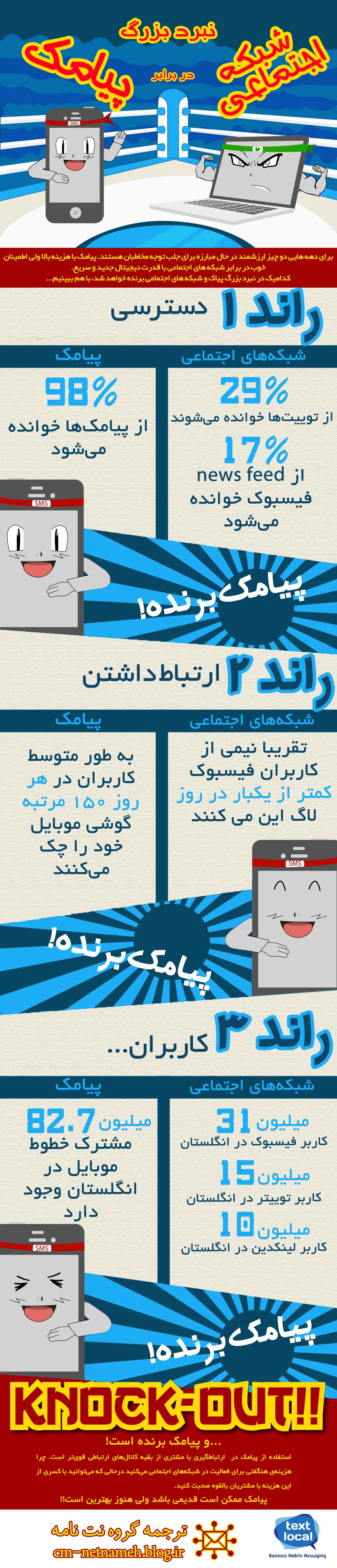 پیامک ابزار جا افتاده ای برای تبلیغات کالا و خدمات است. در مقابل استفاده از شبکه های اجتماعی برای تبلیغات و کسب و کار هر روز گسترش می یابد. در این اینفوگرافیک پیامک و شبکه های اجتماعی در جامعه انگلستان با هم مقایسه شده است. در ادامه شاهد نبر این دو ابزار رسانه ای باشید.